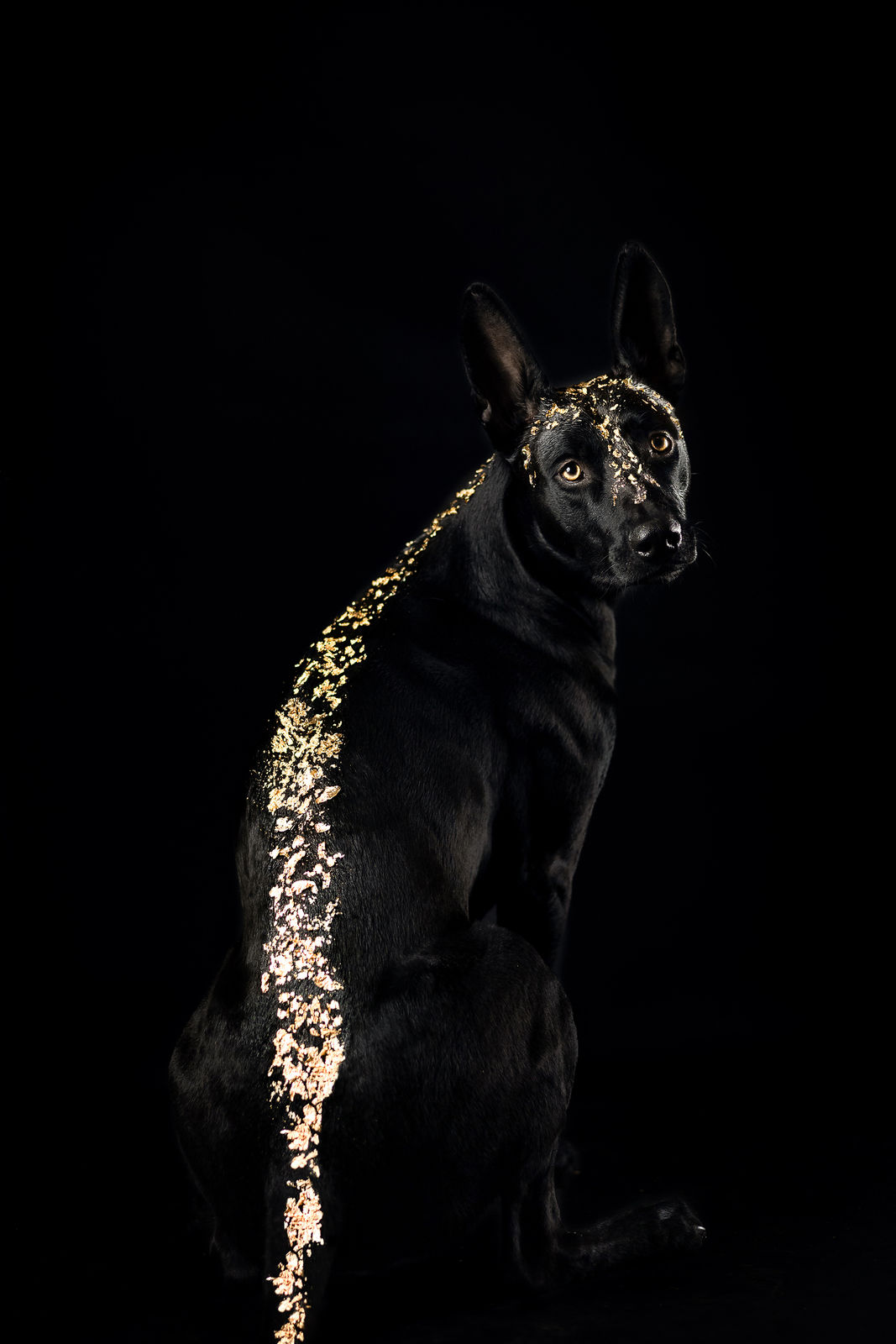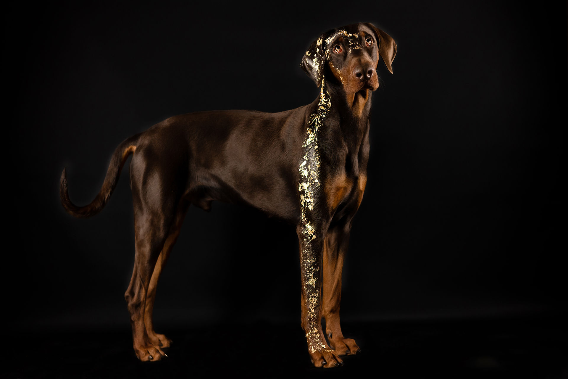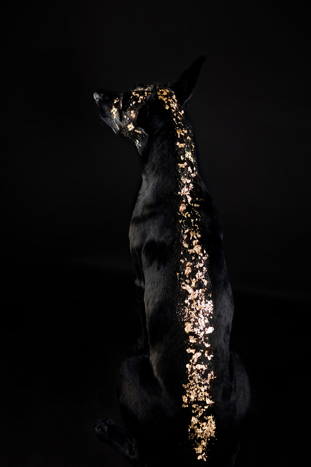 Egal ob wir den Hund mit Glitzersteinen, Blattgold in jeder Variante oder sogar Goldfarbe stylen, alles ist völlig ungefährlich für den Hund. Das Glitzermaterial wird mit Haargel am Hund befestigt und ist nach dem Shooting einfach mit einer Bürste wieder zu entfernen. Die Goldfarbe auf Basis von Babyöl mit einer einfachen Wäsche wieder aus dem Fell zu waschen.